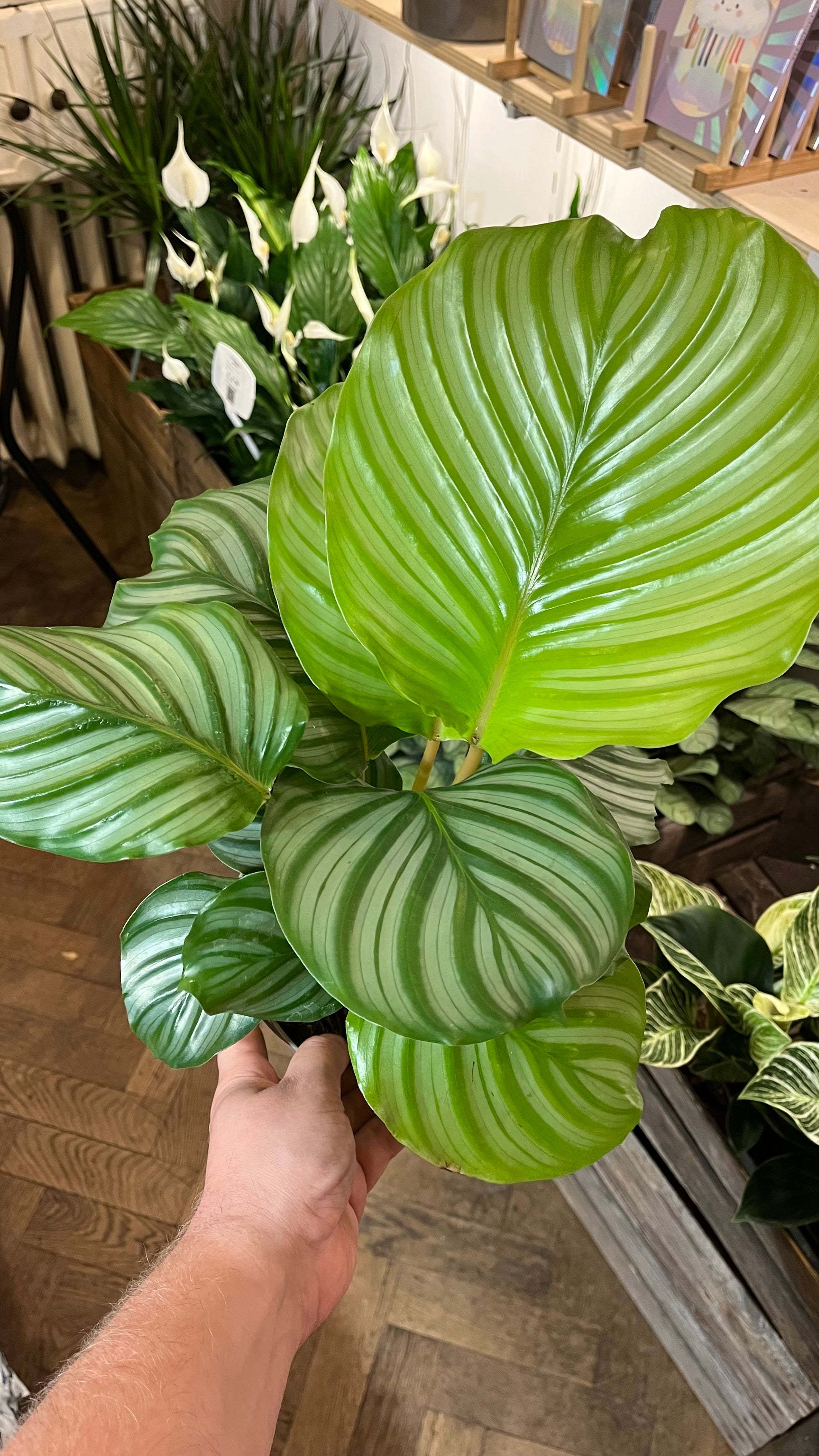 Licht: | Indirect zonlicht / half schaduw Kies bij voorkeur voor een oost- of westraam. Op een zuidraam zul je je plant dieper in je huis moeten plaatsen zodat de plant voldoende licht krijgt maar niet de volle directe zomerzon. Bij te veel zon zullen de bladeren verbranden. Goeppertia sluit net zoals andere soorten van de Maranta-familie (Marantaceae) haar bladeren 's avonds. |