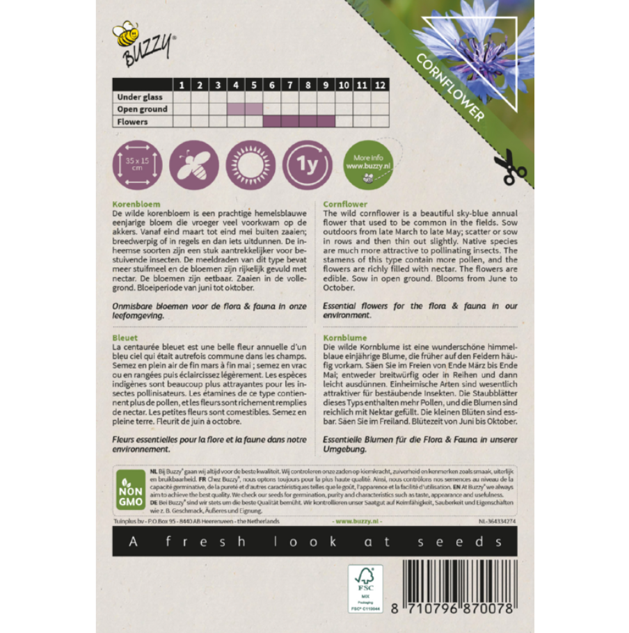 De wilde korenbloem is een prachtige hemelsblauwe eenjarige bloem die vroeger veel voorkwam op de akkers. Vanaf eind maart tot eind mei buiten zaaien; breedwerpig of in regels en dan iets uitdunnen. De inheemse soorten zijn een stuk aantrekkelijker voor bestuivende insecten. De meeldraden van dit type bevat meer stuifmeel en de bloemen zijn rijkelijk gevuld met nectar. De bloemen zijn eetbaar. Zaaien in de vollegrond. Bloeiperiode van juni tot oktober.