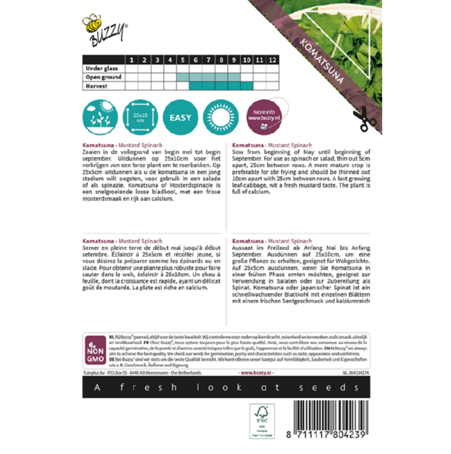 Zaaien in de vollegrond van begin mei tot begin september. Uitdunnen op 25x10cm voor het verkrijgen van een forse plant om te roerbakken. Op 25x5cm uitdunnen als u de komatsuna in een jong stadium wilt oogsten, voor gebruik in een salade of als spinazie.
